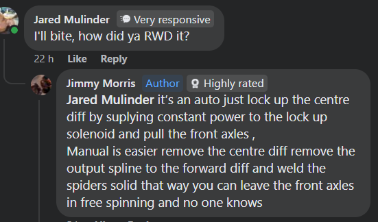 Although, maybe he is correct. I thought he meant remove the centre diff permanently! I guess if you machine off the splines that drive the front diff and weld up the spider gears in the centre diff... it could work.